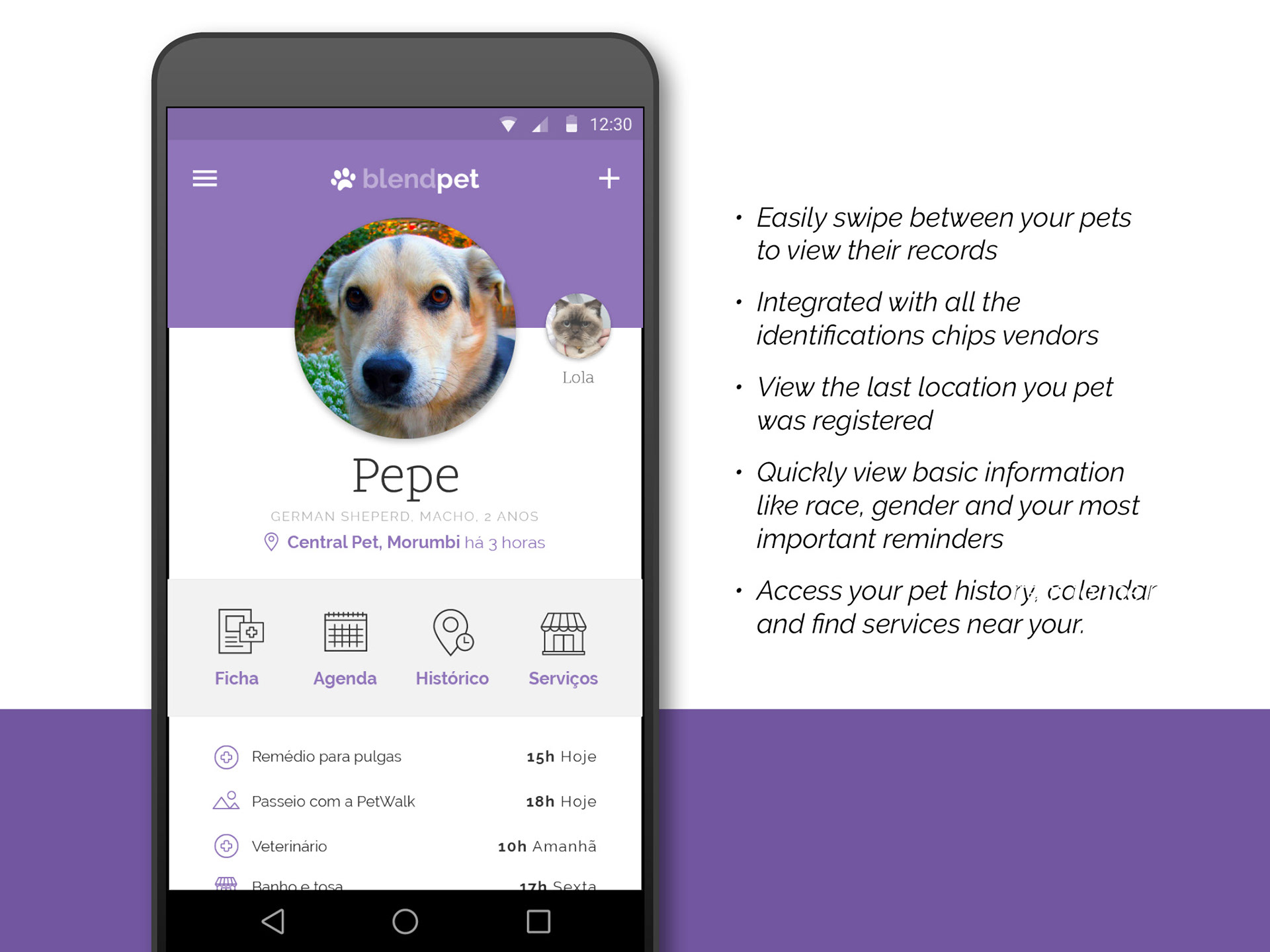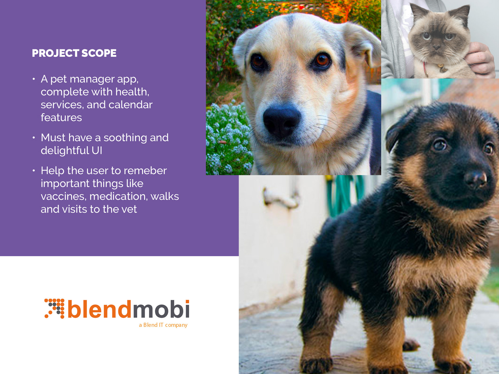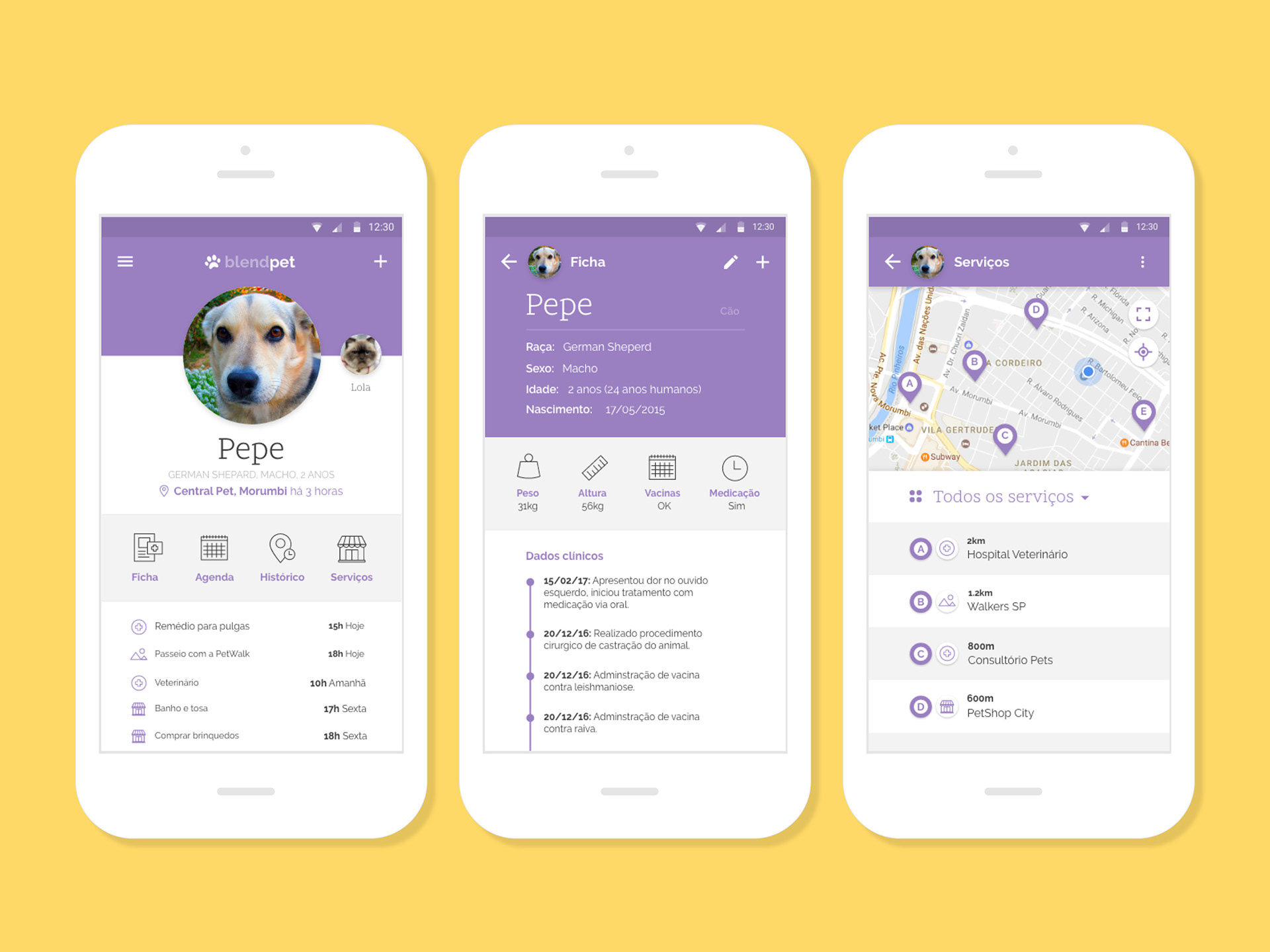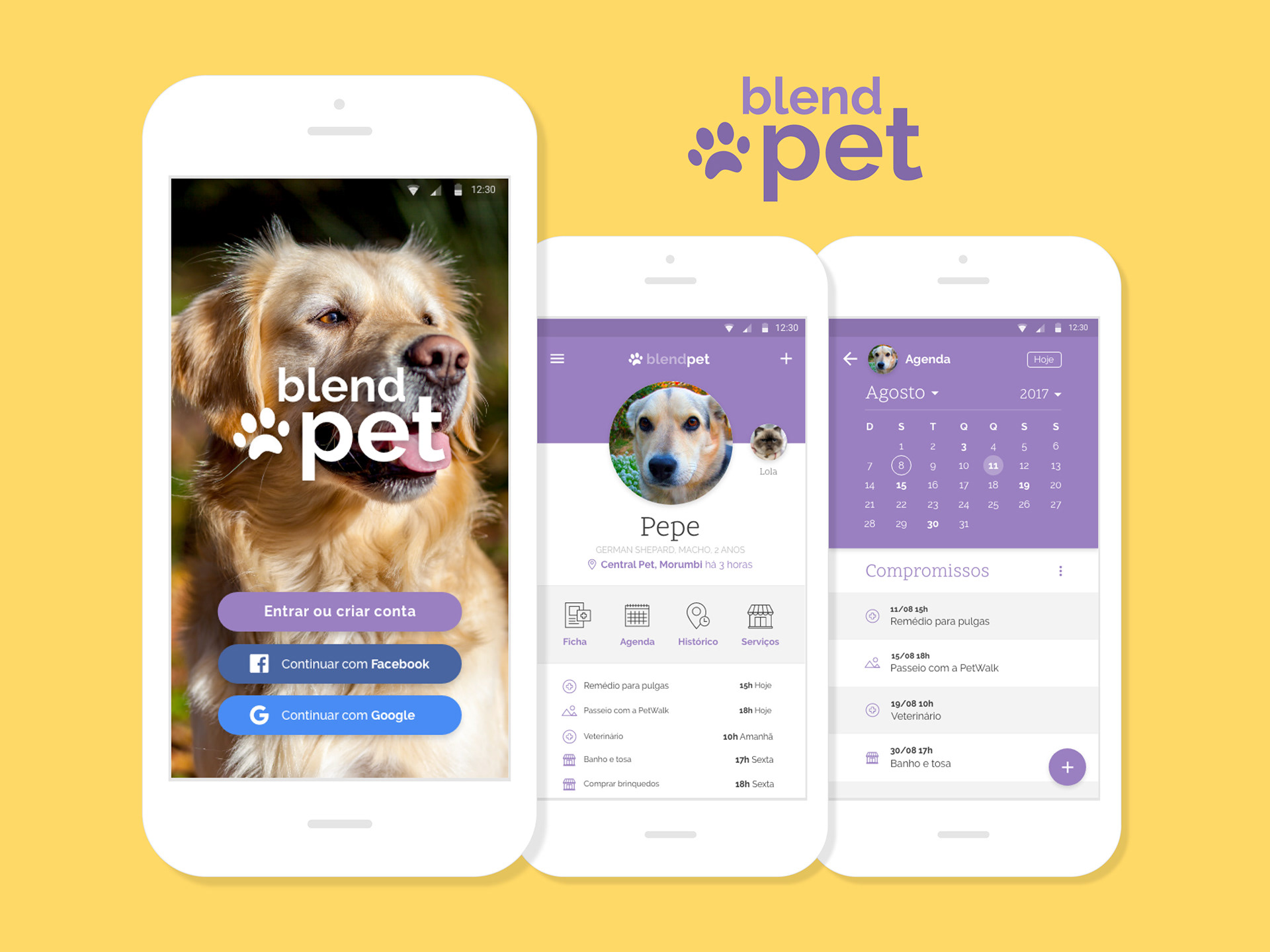 BlendPet is a pet manager app complete with health, services, and calendar features. I was asked to design the app user interface and visual identity, considering the user's needs and introducing a location element.