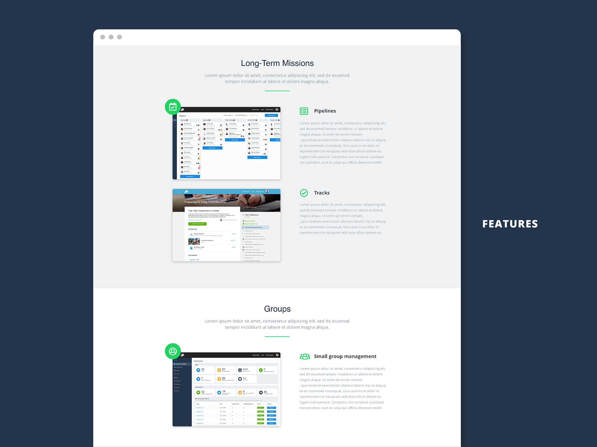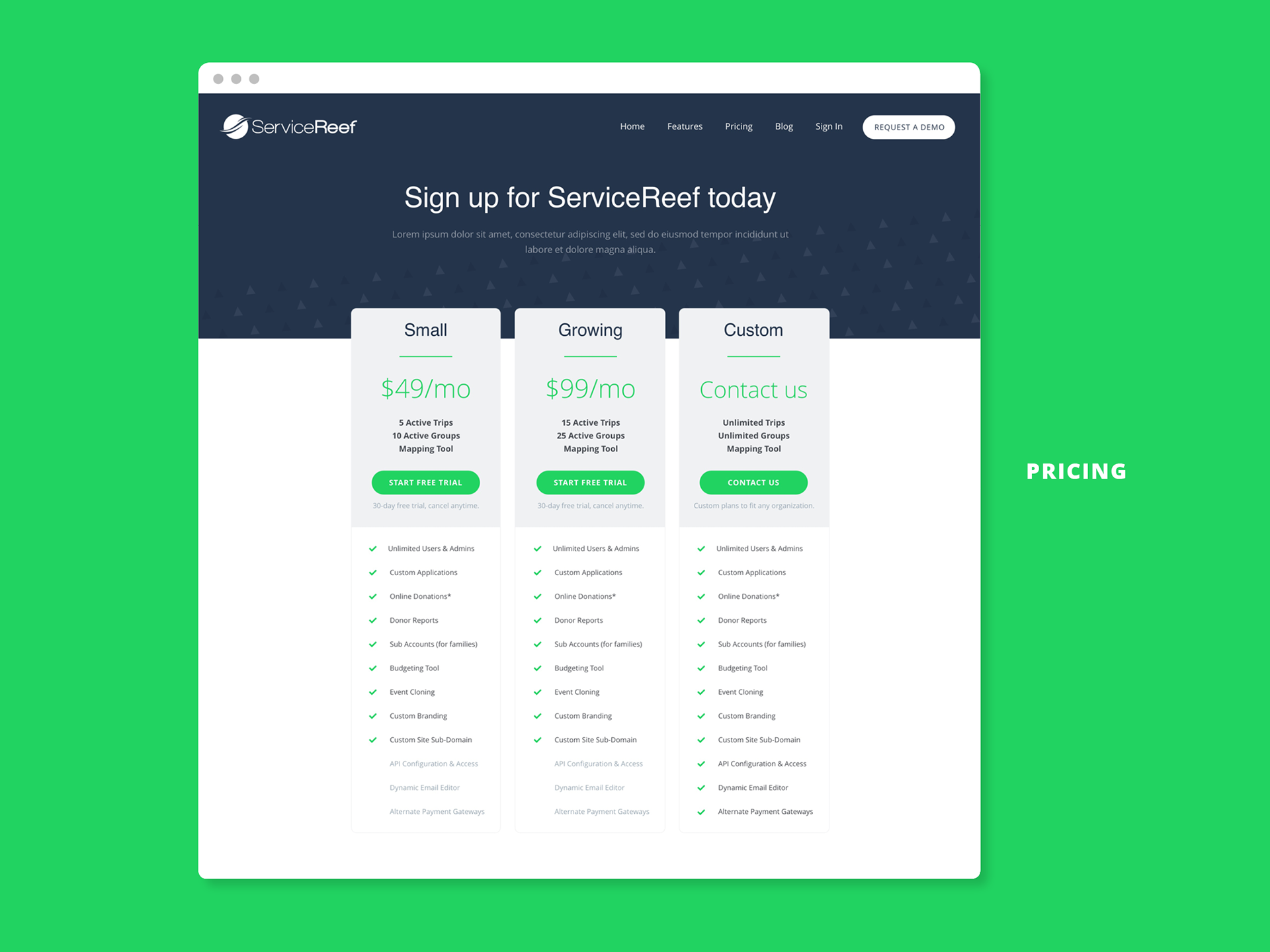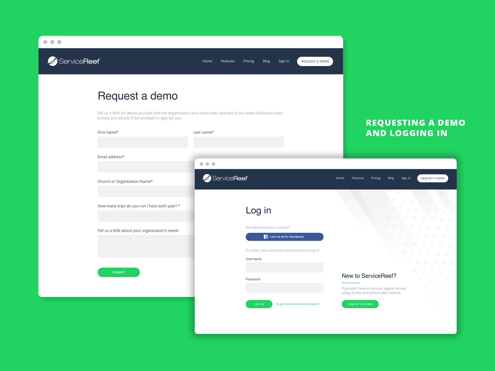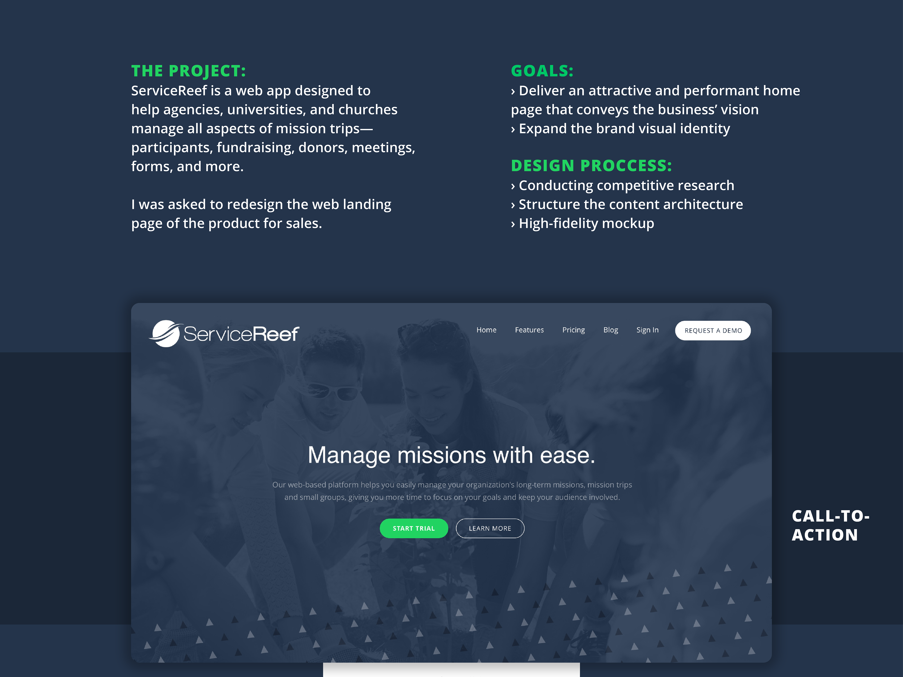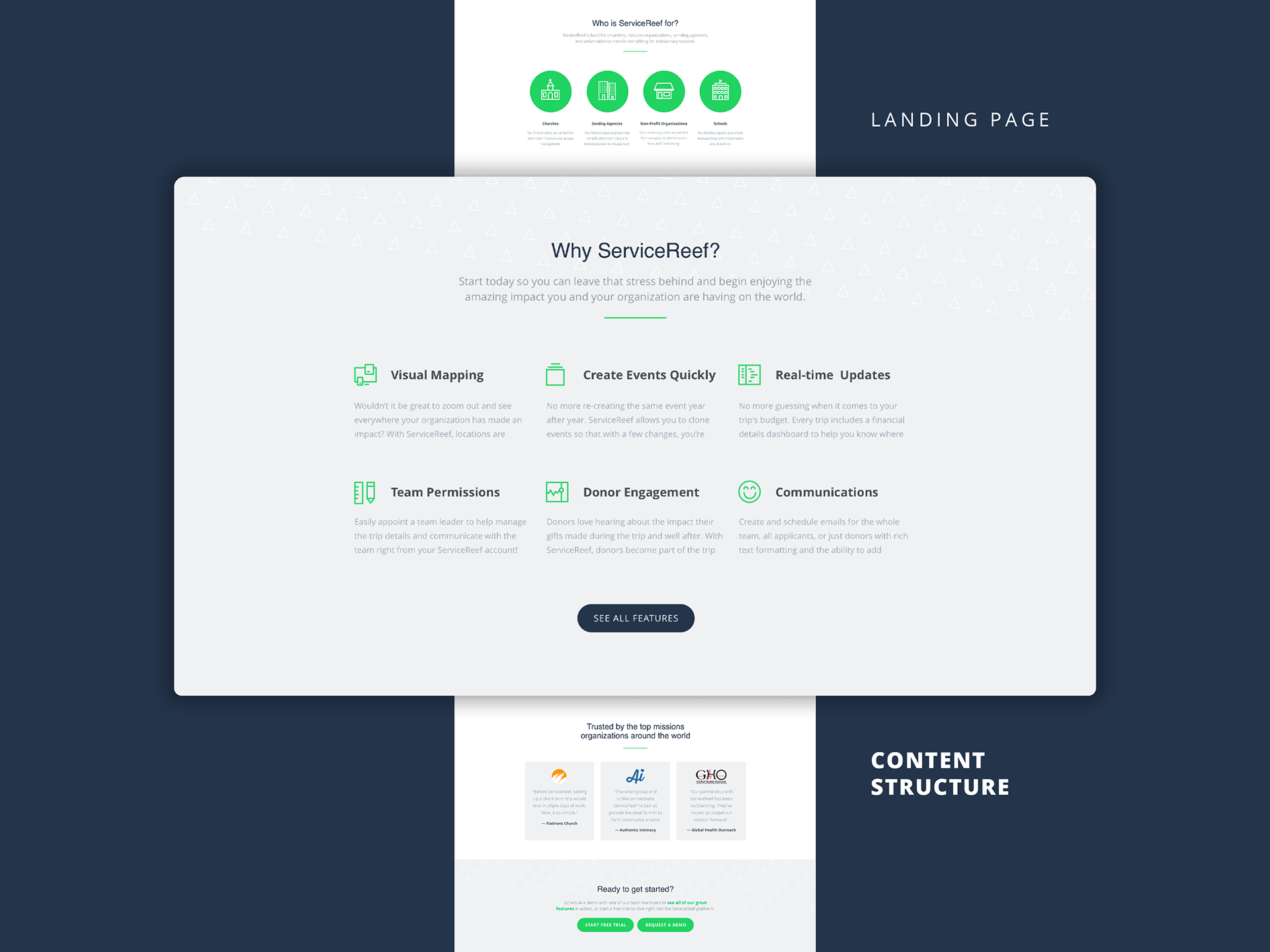 ServiceReef is a web app designed to help agencies, universities, and churches manage all aspects of mission trips—participants, fundraising, donors, meetings, forms, and more. I was asked to redesign the web landing page of the product for sales.